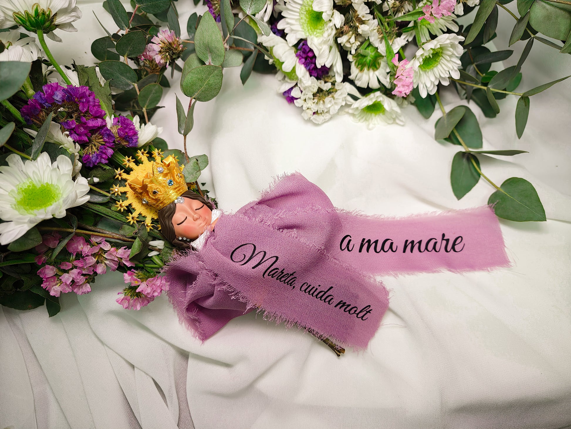 ya están aquí nuestros maravillosos packs ofrenda: un pack en el que incluirá una Angeleta y una cinta personalizada (tú eliges el color y el texto) para así llevar contigo en ese día tan especial a un ser querido, recordarle, o a nuestra querida Mareta para que te acompañe en el trayecto. Es un recuerdo precioso que luego puedes guardar para siempre y recordar esa ofrenda, esa promesa, a esa persona...sin duda, un detalle muy especial y muy sentido.