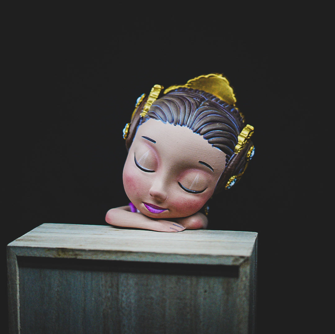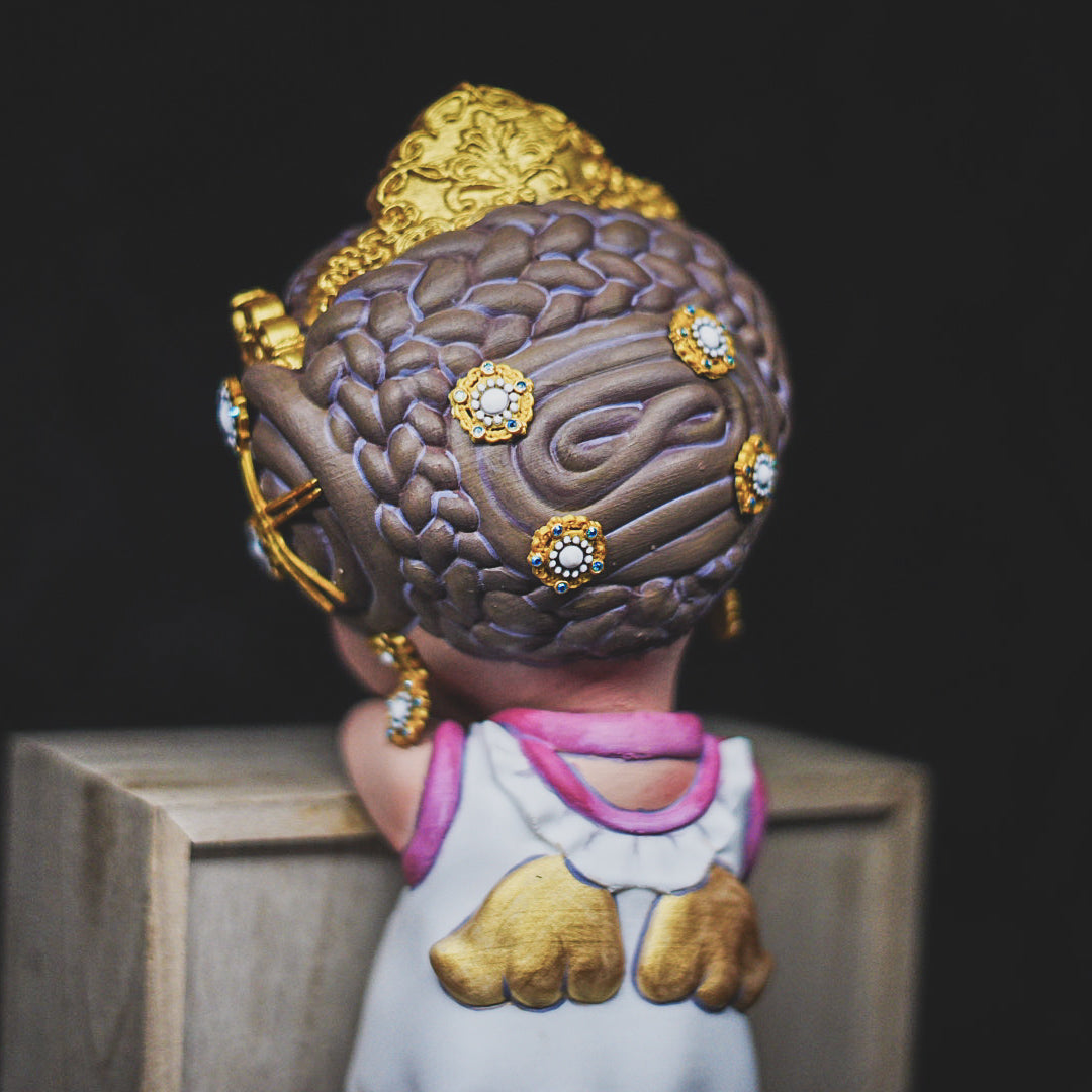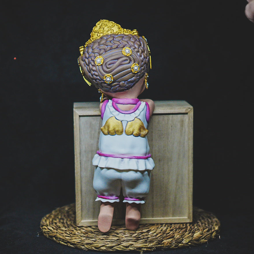 Y aquí tenemos nuestra Angeleta en tamaño grande, de 33 cm, con sus perlas en rojas, adrezo oro y su pelo marrón chocolate, ha sido pintada a mano hasta el más mínimo detalle.