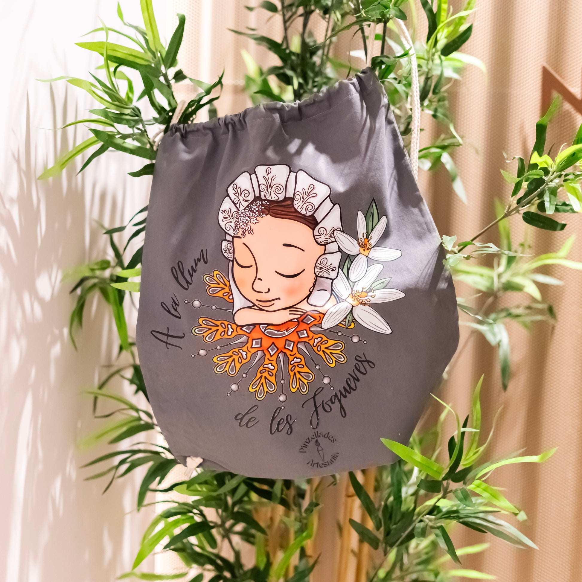 Mochila de tela en color gris con la ilustración "A la llum de les Fogueres" con las medidas 45x38 cm. Asas de cuerda blancas. 100% de algodón.