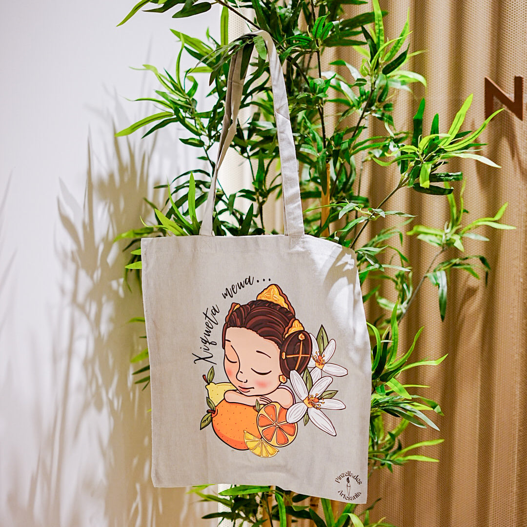 Totebag gris con asa larga(medida del asa: 30cm) con medidas 38x40 cm. Su material es 100% algodón. Contiene la ilustración "Xiqueta meua" estampada con unos colores de gran calidad. Perfecta para hacer la compra o transportar tus pertenencias de un lugar a otro. La totebag beige disponible en asa corta.